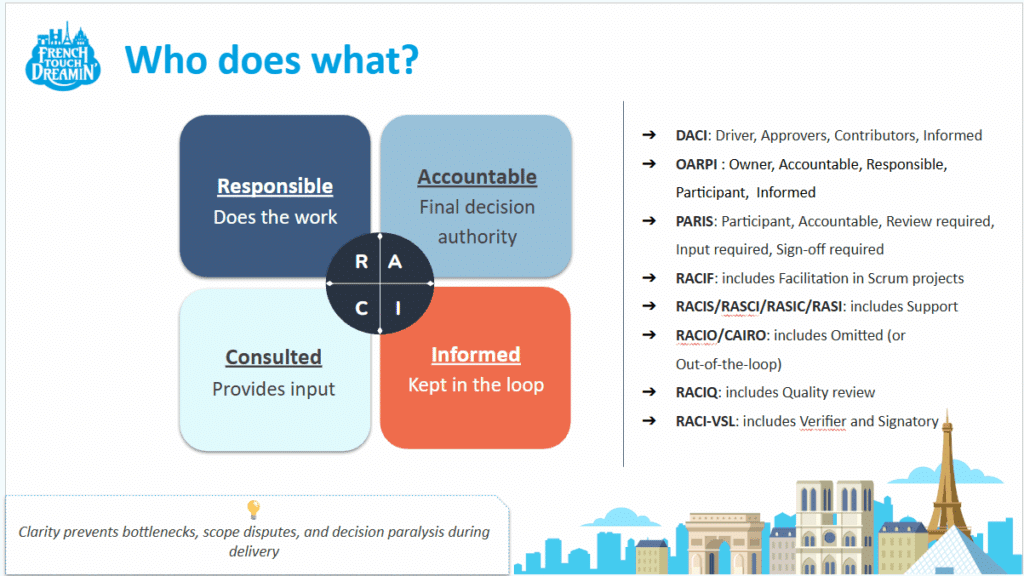 - Driver (Pilote), Approver (Approbateur), Contributors (Contributeurs), Informed (Informé). Ce modèle est redoutable pour débloquer les situations où tout le monde a un avis mais personne ne tranche.