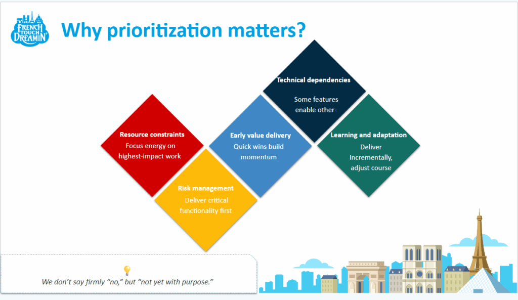 Si tout est prioritaire, alors rien ne l’est. Le but n’est pas de dire « Non » mais plutôt « pas maintenant, et voici pourquoi« . L’enjeu est là : assurer la viabilité de la feuille de route tout en respectant les parties prenantes et les idées qu’elles ont émises lors des ateliers.