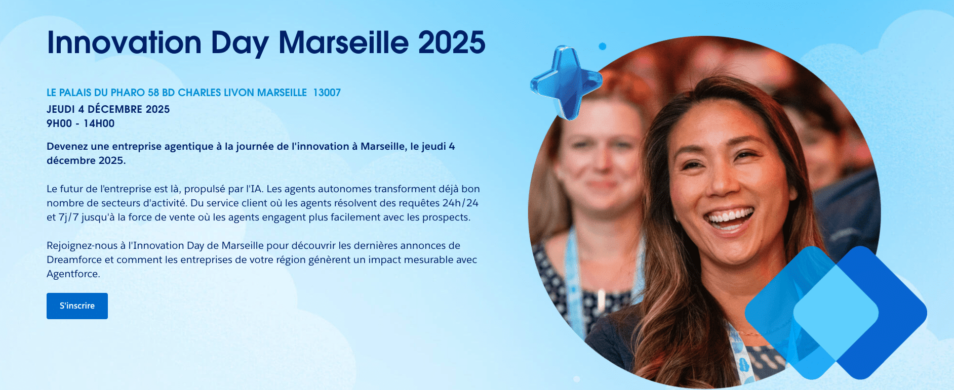 Rejoignez-nous à l’Innovation Day de Marseille pour découvrir les dernières annonces de Dreamforce et comment les entreprises de votre région génèrent un impact mesurable avec Agentforce.